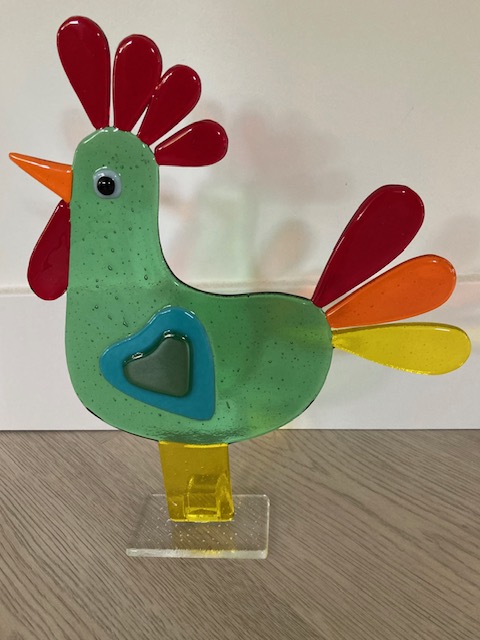 In opdracht gemaakt. De haan gaat een eerder gekochte kip gezelschap houden.